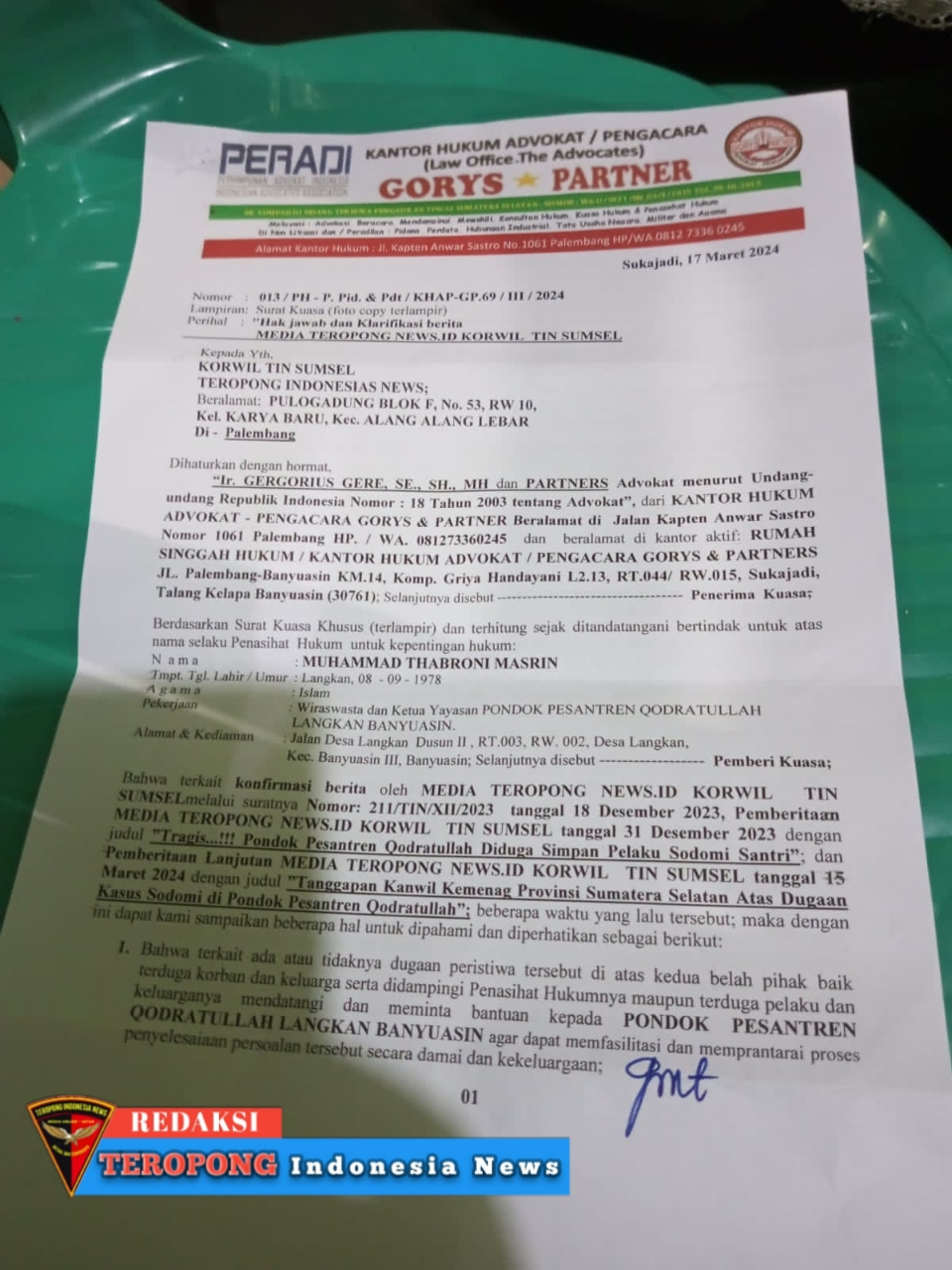 Tim Media TIN menanggapi surat nomor: 013/PH-P.Pid.&Pdt/KHAP-GP.69/III/2024 perihal : Hak Jawab kepada korwil media Teropong Indonesia news yang disampaikan oleh Muhammad Thabroni Masrin selaku ketua yayasan Pondok Pesantren Qotratullah Langkan Kabupaten Banyuasin melalui kuasa hukumnya Ir.Gergorius Gere, SE. SH. MH.dan Partners.