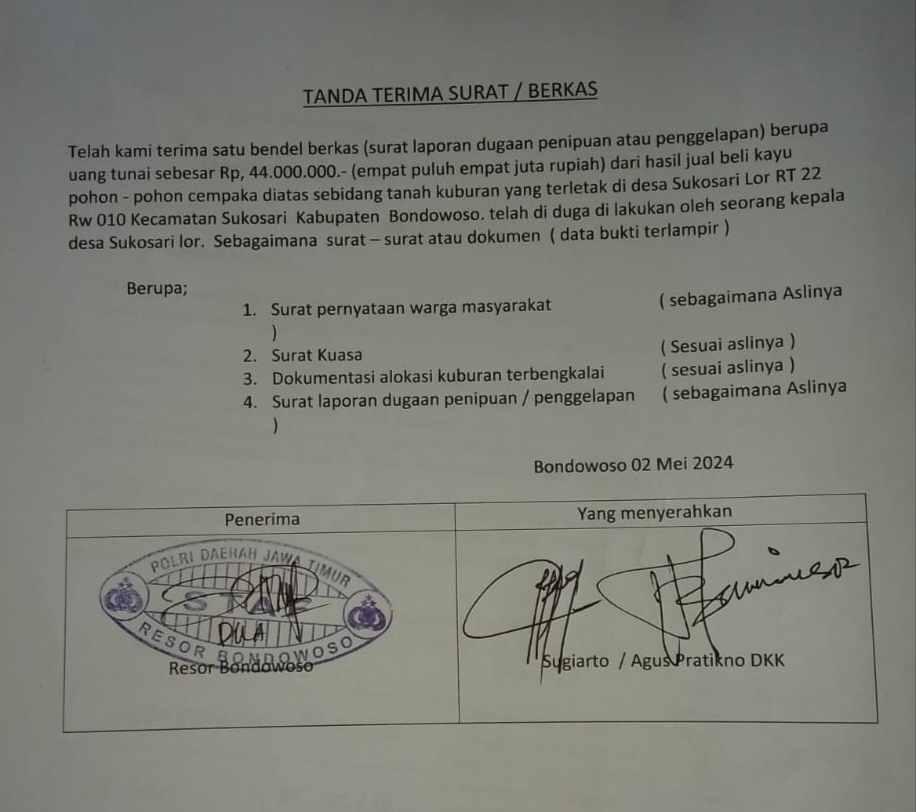 Bondowoso – Setelah melalui beberapa pertimbangan yang pada awalnya adalah musyawarah bersama antara Seorang Kepala Desa Sukosari Lor Kecamatan Sukosari Kabupaten Bondowoso tentang penjualan pohon Cempaka yang tidak di temukan titik terang, Akhirnya Sugiarto, 54 Tahun, Warga Dusun Koanyar Desa Sukosari Lor mendatangi Mapolres Bondowoso berdasarkan surat Kuasa Khusus dari para Pemberi Kuasa, diantaranya adalah : Agus Pratikno, 44 Tahun Warga Desa Sukosari Lor RT 22 RW 10 Kecamatan Sukosari Kabupaten Bondowoso dan 3 orang lainnya melaporkan Mahfud, Kepala Desa Sukosari Lor Kecamatan Sukosari Kabupaten Bondowoso, Kamis, 2 Mei 2024.