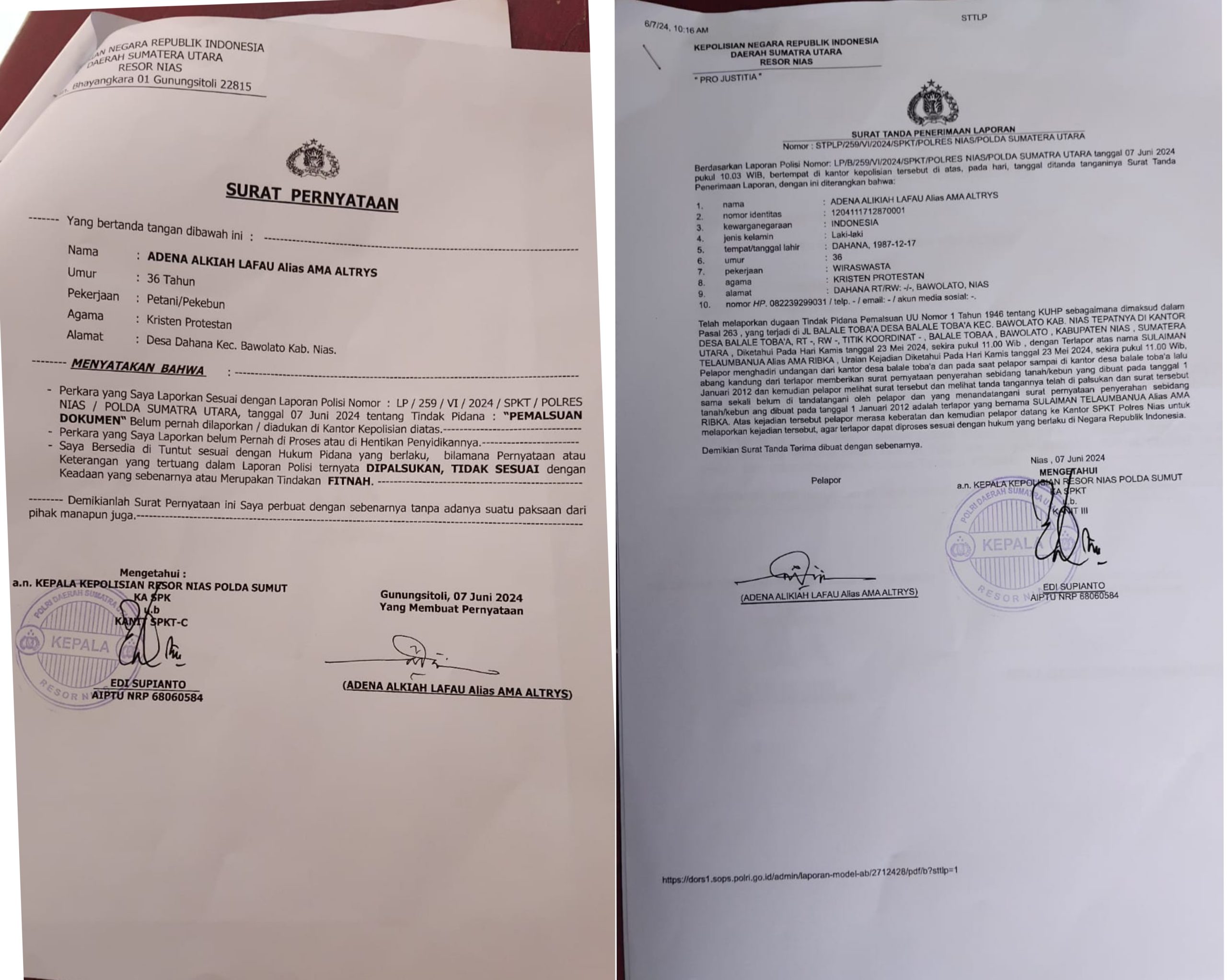 “Saya melaporkan tentang dugaan pemalsuan tanda tangan yang saya ketahui pada musyawarah desa dalam pembicaraan sengketa tanah antara orang tua saya di Kantor Desa Balale Tobaa, Kecamatan Bawolato, Kabupaten Nias pada 23 Mei 2024,” jelas Adena.