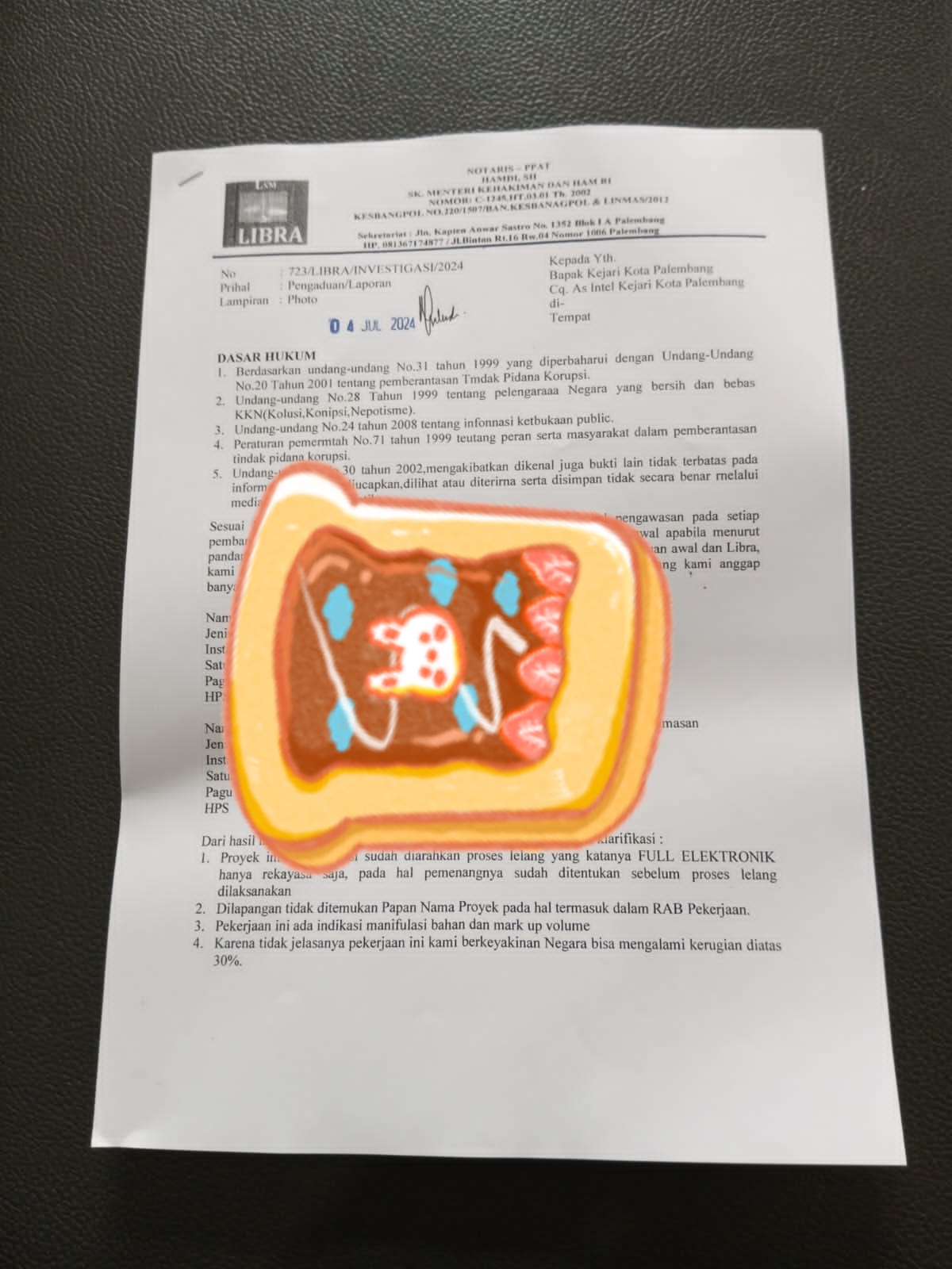 Hal ini diperkuat atas diterimanya laporan/ pengaduan LSM LIBRA tersebut pada pelayanan PTSP Kajari Palembang tertanggal 4/7/2024.