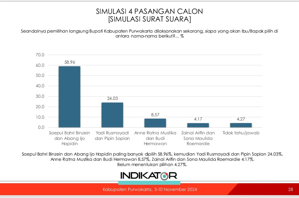 Survei juga mencatat elektabilitas individu calon bupati di Purwakarta. Saepul Bahri Binzein menempati posisi teratas dengan dukungan 57,7 persen, disusul Yadi Rusmayadi di angka 24,8 persen.