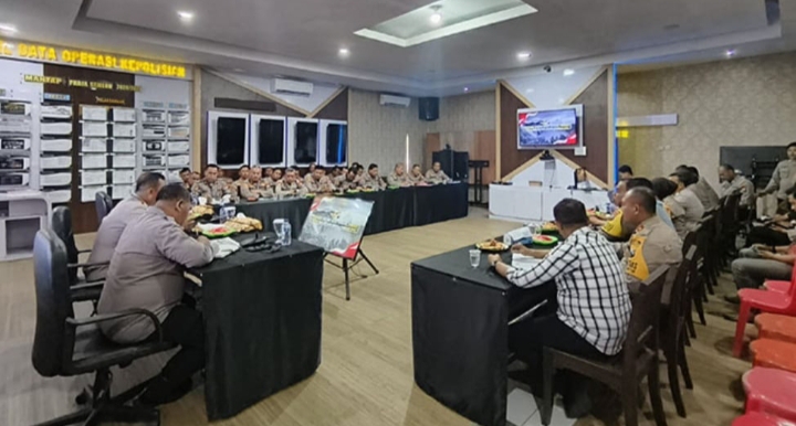 Banyuwangi, 22 November 2024 – Polresta Banyuwangi menggelar rapat koordinasi (Rakor) di Command Center Mapolresta guna mematangkan strategi pengamanan Pilkada Serentak 2024. Rakor yang dihadiri Pejabat Utama (PJU) Polresta dan seluruh Kapolsek jajaran ini difokuskan pada kesiapan pengamanan di setiap tahapan penyelenggaraan, khususnya distribusi logistik, masa tenang, dan pemungutan suara.