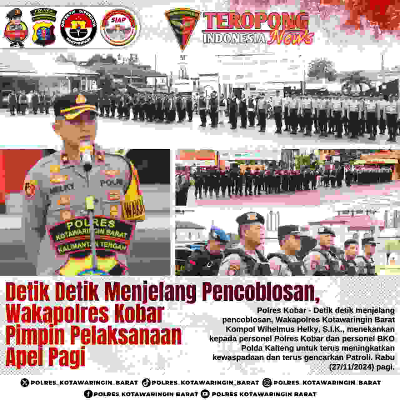 Polres Kobar – Detik detik menjelang pencoblosan, Wakapolres Kotawaringin Barat Kompol Wihelmus Helky, S.I.K., menekankan kepada personel Polres Kobar dan personel BKO Polda Kalteng untuk terus meningkatkan kewaspadaan dan terus gencarkan Patroli. Rabu (27/11/2024) pagi.