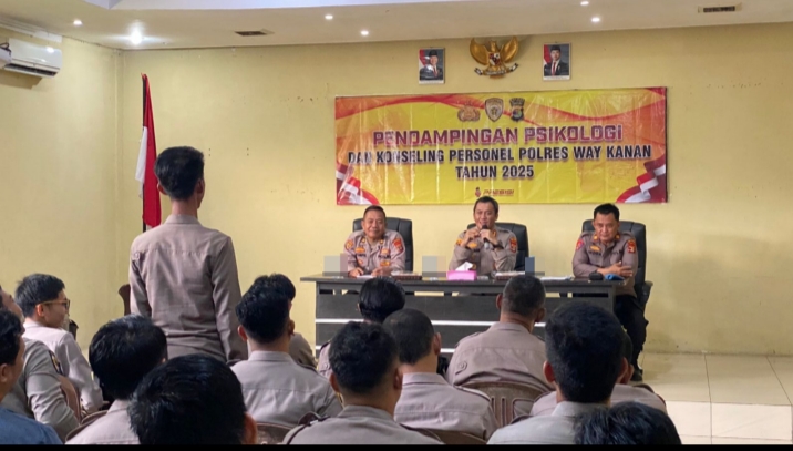 Way Kanan – Dalam rangka memperbaiki mental personel Polres Way Kanan untuk menjadikan Abdi Negara yang bertanggung jawab kepada Negara guna memberikan perlindungan, pengayoman, dan pelayanan kepada masyarakat. Kapolres Way Kanan AKBP Adanan Mangopang melaksanakan kegiatan pendampingan psikologi, konseling dan arahan kepada personel Polres Way Kanan di aula Adhi Pradana Polres Way Kanan. Sabtu (08/02/2025).