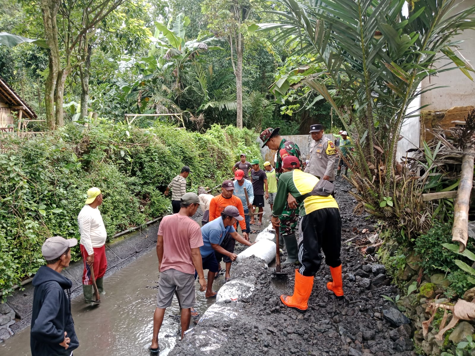 Dengan Peralatan yang memang sudah benar – benar di siapkan dalam mengatasi setiap bencana, Warga desa sekitar serta Anggota Polsek serta Koramil bahu membahu membetulkan saluran yang telah rusak akibat bencana yang sudah terjadi.