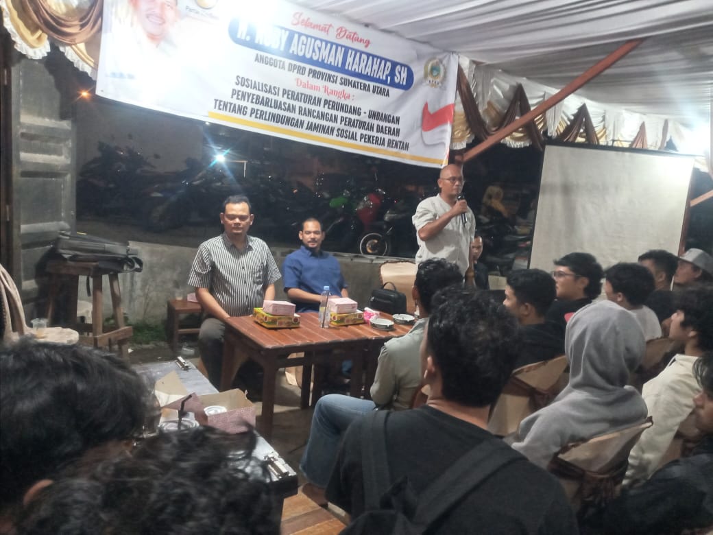 Padangsidimpuan – Setelah gelar kegiatan sosialisasi Ranperda tentang pemajuan kebudayaan kemarin, kali ini Anggota Dewan Perwakilan Rakyat Daerah Sumatera Utara (DPRD Sumut) Fraksi NasDem, H. Roby Agusman Harahap, S.H., sosialisasikan peraturan perundang-undangan penyebarluasan rancangan peraturan daerah tentang perlindungan jaminan sosial pekerja rentan kepada warga kota Padangsidimpuan, di Kelurahan Aek Tampang, Kecamatan Padangsidimpuan Selatan, Kota Padangsidimpuan, Kamis (20/03/2025)