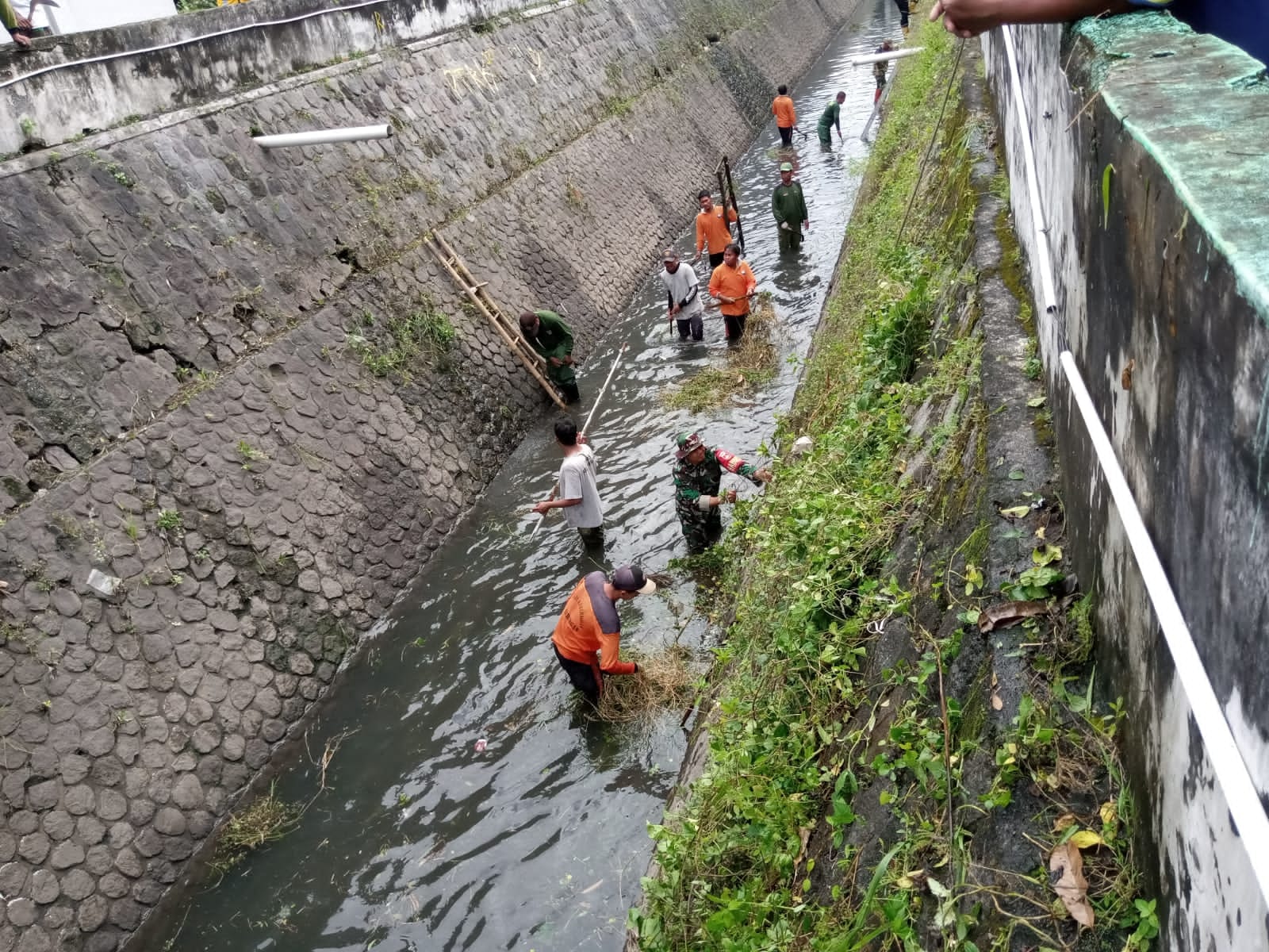 Apel dilanjutkan dengan kegiatan karya bakti yang fokus pada pembersihan aliran sungai dan pembersihan tanaman liar di plengsengan sungai.
