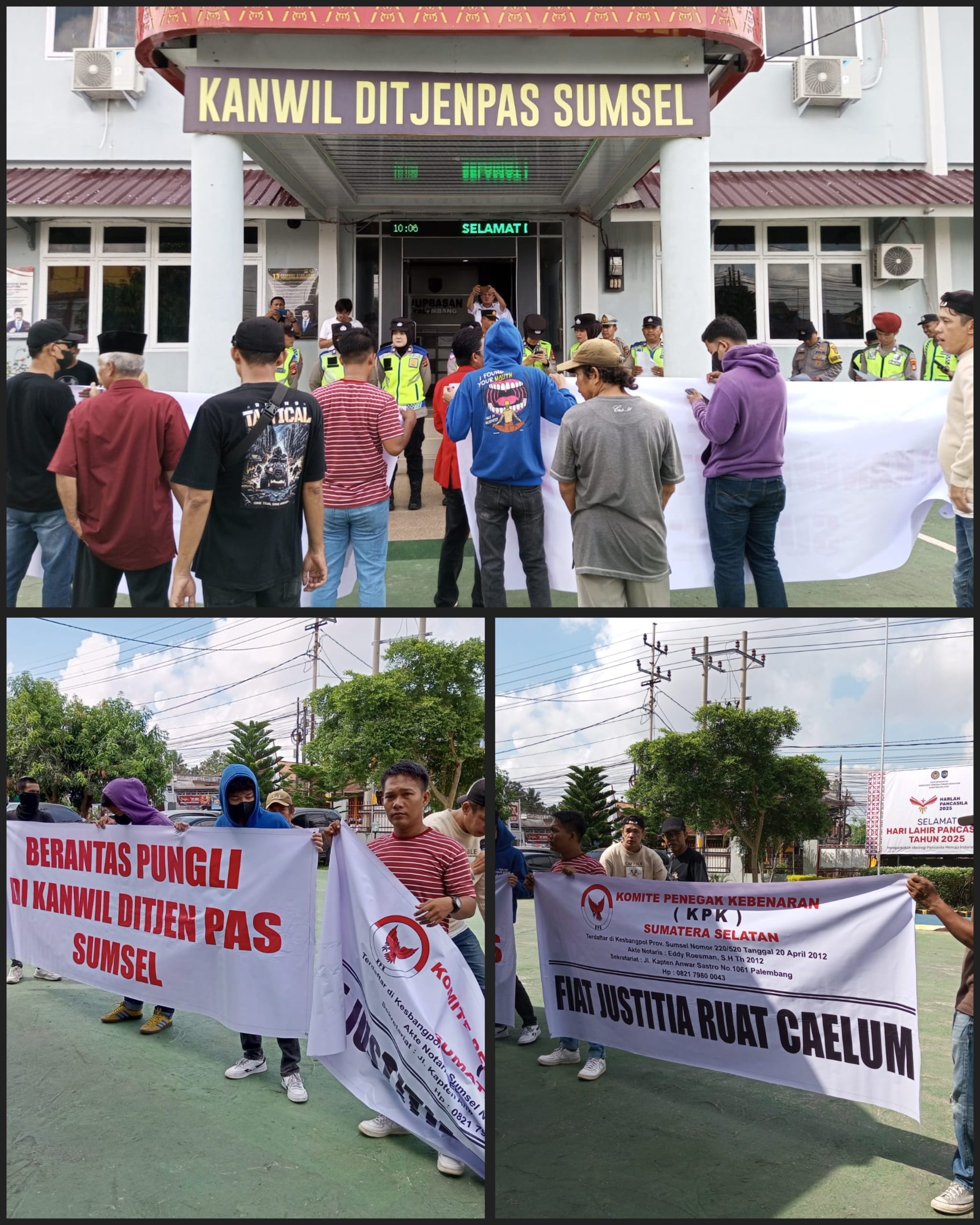 Palembang, 12 Juni 2025 – Ketua LSM Komite Penegak Kebenaran (KPK) Sumatera Selatan, M. Isa, SE, memimpin aksi demonstrasi damai di halaman Kantor Wilayah Direktorat Jenderal Pemasyarakatan (Kanwil Ditjenpas) Sumsel, Jalan Inspektur Marzuki (Pakjo Ujung Palembang), Kamis (12/6/2025). Aksi tersebut menuntut penindakan tegas terhadap dugaan pungutan liar (pungli) yang terjadi di sejumlah Rumah Tahanan (Rutan) dan Lembaga Pemasyarakatan (Lapas) di wilayah hukum Sumatera Selatan.