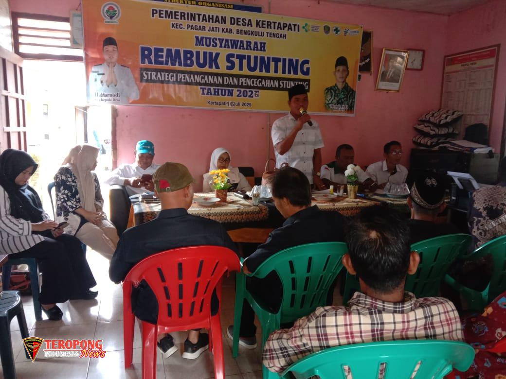 Bengkulu Tengah – Desa Kertapati, Kecamatan Pagar Jati, Kabupaten Bengkulu Tengah, menggelar Musyawarah Rembuk Stunting . Acara penting ini dihadiri oleh berbagai pihak, termasuk Kepala Desa (Kades) Harmodi, perwakilan Puskesmas Pagar Jati (diwakili oleh PLKB), Pendamping Desa/Lokal Desa, Badan Permusyawaratan Desa (BPD), Ibu Camat, Ketua Posyandu beserta seluruh anggotanya, dan masyarakat Desa Kertapati. Kamis,16/07/2025