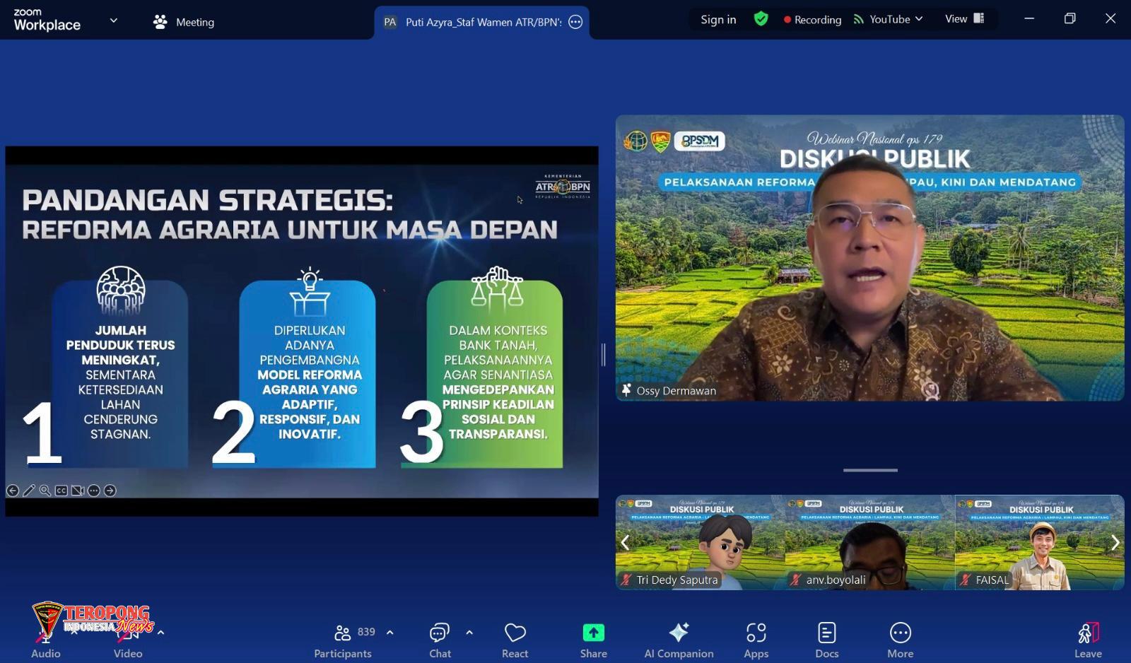 Jakarta – Wakil Menteri Agraria dan Tata Ruang/Wakil Kepala Badan Pertanahan Nasional (Wamen ATR/Waka BPN), Ossy Dermawan, membuka Webinar Nasional Diskusi Publik “Pelaksanaan Reforma Agraria: Lampau, Kini, dan Mendatang” pada Kamis (17/07/2025). Dalam sambutannya, ia mengatakan bahwa Reforma Agraria bukan hanya tentang membagi tanah, tetapi juga tentang memperbaiki, membangun harapan, dan menciptakan keadilan yang berkelanjutan.