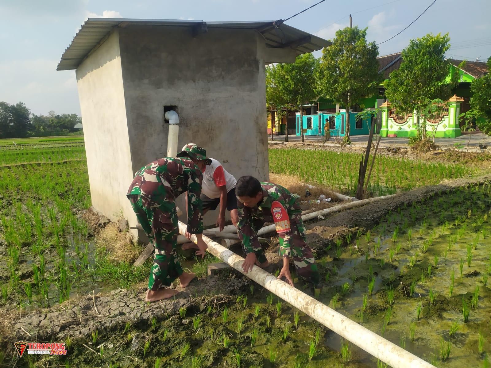 Sragen, Senin (28/07/2025) Serda Wahyudi beserta anggota Babinsa Koramil 15/Gemolong Kodim 0725/Sragen dengan para petani di Dk.Jago RT.07 Ds.Kalangan untuk meningkatkan sistem irigasi sawah. Kegiatan yang dilakukan ini berfokus pada pemasangan pipa pralon untuk saluran irigasi, guna memastikan ketersediaan air yang cukup bagi tanaman padi.