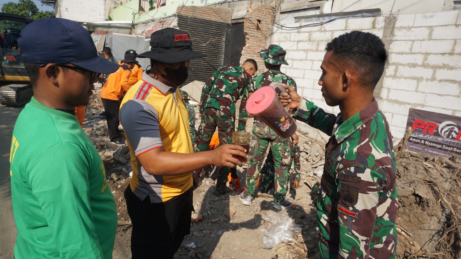 Surakarta – Anggota Satgas TMMD Reguler Ke-125 Kodim 0735/Surakarta bersama dengan warga masyarakat menikmati segelas air teh manis untuk melepas dahaga disela-sela pengerjaan sasaran fisik perbaikan saluran air di lokasi TMMD Reguler Ke-125 Kodim 0735/Surakarta yang digelar di Jln. Mojo, Kelurahan Karangasem ,Kecamatan Laweyan.