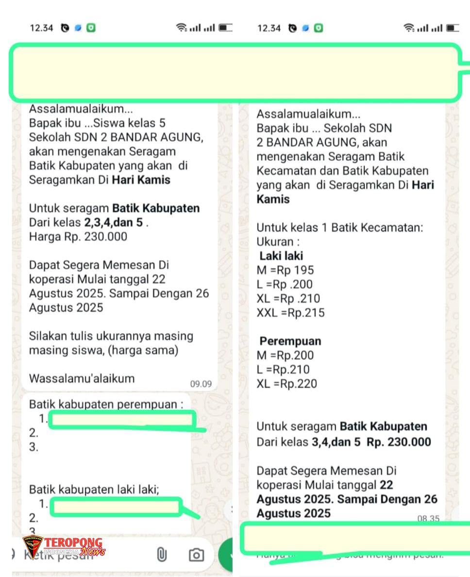 Terkait adanya pemberitahuan pemesan seragam sekolah bagi siswa-siswinya yang disampaikan melalui informasi pesan WhatsApp grup kelas oleh pihak Sekolah Dasar Negeri 2 Bandar Agung, yang diduga kuat adanya indikasi pungutan liar (Pungli) berwajah penjualan seragam batik yang dilakukan secara kolektif melalui Koperasi Sekolah, dengan mengatasnamakan Seragam ”Batik Kecamatan dan Batik Kabupaten“. Selasa, (26/08/2025)