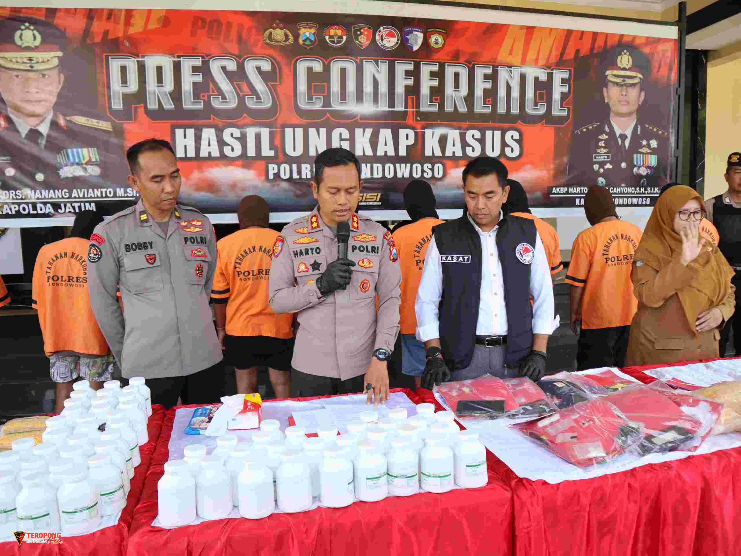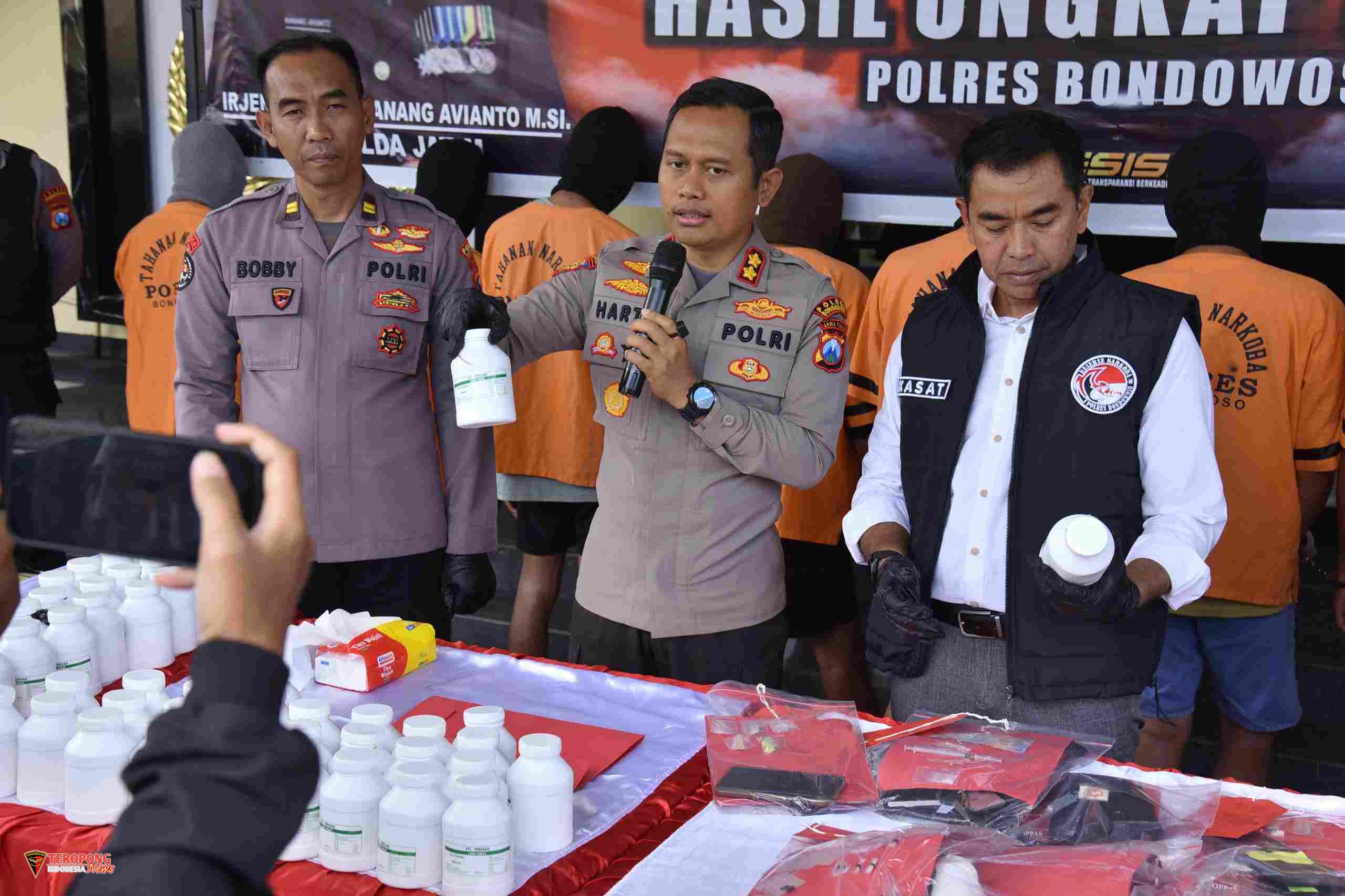 Kapolres Bondowoso AKBP Harto Agung Cahyono didampingi Kasat Narkoba, AKP Deky Julkarnain dan Kasi Humas, Iptu Bobby Dwi Siswanto mengatakan dari hasil pengungkapan itu Polisi mengamankan 11 tersangka.