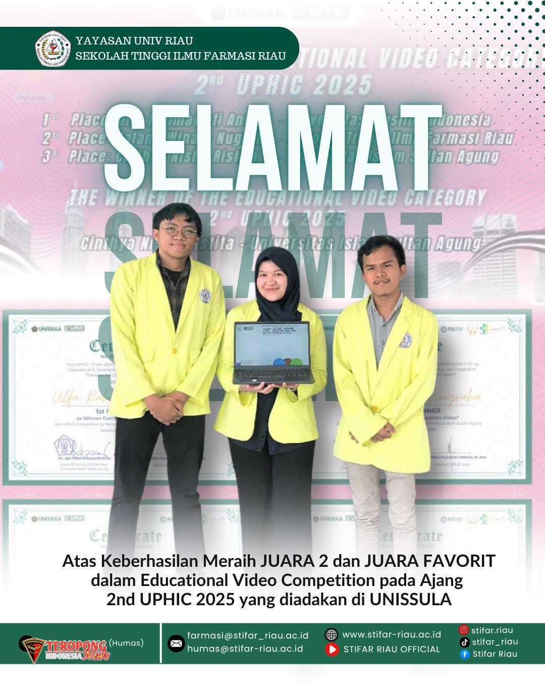 Tim mahasiswa Sekolah Tinggi Ilmu Farmasi Riau ( STIFAR Riau) berhasil raih Juara diajang internasional 2nd UPHIC yang diadakan di Universitas Islam Sultan Agung Semarang Jawa Tengah.