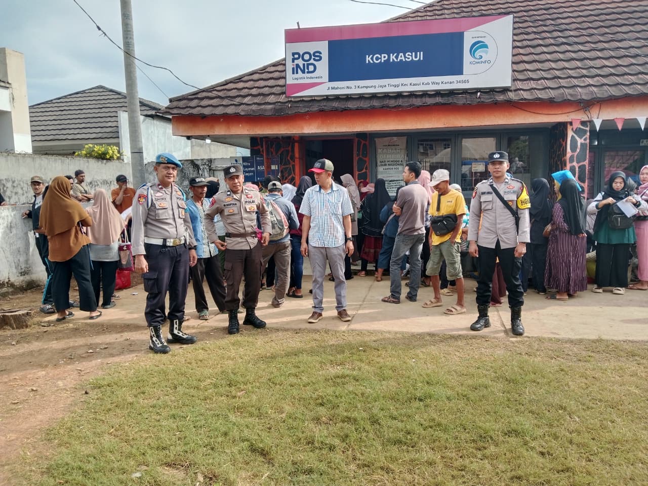 WAY KANAN – Polsek Kasui Polres Way Kanan melakukan pengamanan dan monitoring kegiatan penyaluran bantuan langsung tunai sementara kesejahteraan rakyat (BLTS Kesra) di Kantor Pos 34765 Cabang Kasui, Kampung Jaya Tinggi, Kecamatan Kasui Kabupaten Way Kanan. Jum’at (28/11/2025)