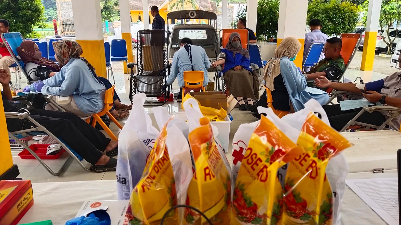JEMBER-Lama tidak menggelar donor darah, akhirnya Kecamatan Pakusari, Jember, Jawa Timur Kamis (22/01/26) kembali mengadakan aksi kemanusiaan untuk warganya. Pada donor darah tersebut, warga yang menyumbangkan darahnya mendapatkan 900 ml minyak goreng selain juga kalender dari PMI Kabupaten Jember.