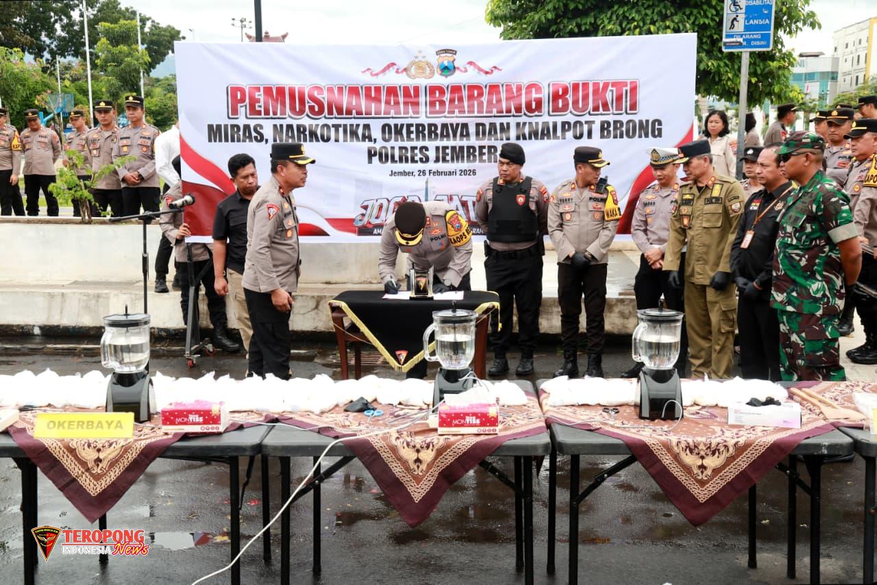 Kali ini Polres Jember bersama jajaran Forum Koordinasi Pimpinan Daerah (Forkopimda) Kabupaten Jember memusnahkan ribuan botol minuman keras, narkotika, hingga knalpot tidak sesuai spesifikasi hasil Operasi Penyakit Masyarakat (Pekat).