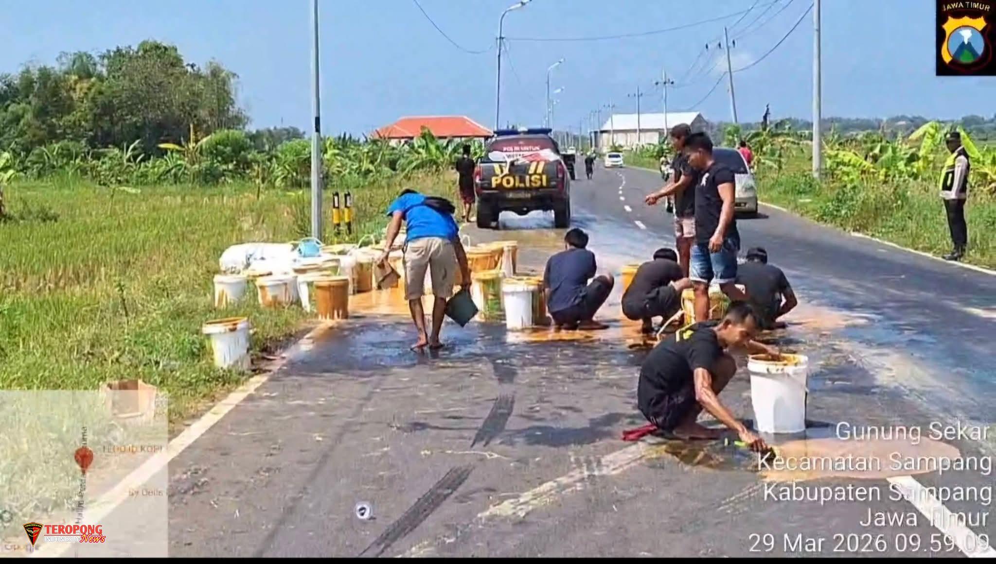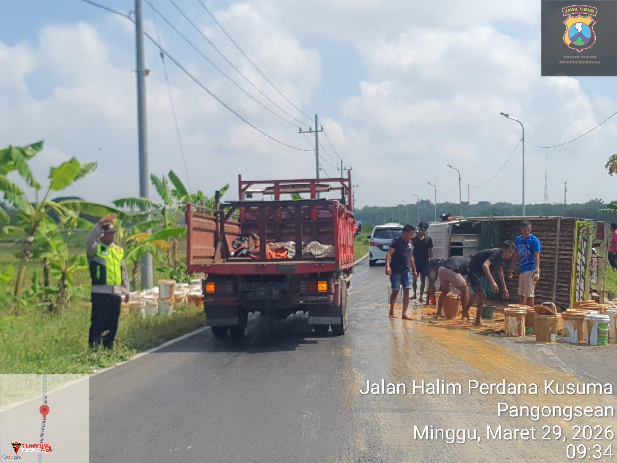 Sampang, 29 Maret 2026 – Sebuah kendaraan pick up yang mengangkut petis mengalami kecelakaan tunggal dan terguling di Jalan Halim Perdana Kusuma, Desa Pangongsean, Kecamatan Torjun, Kabupaten Sampang, Minggu (29/3/2026) sekitar pukul 09.30 WIB.