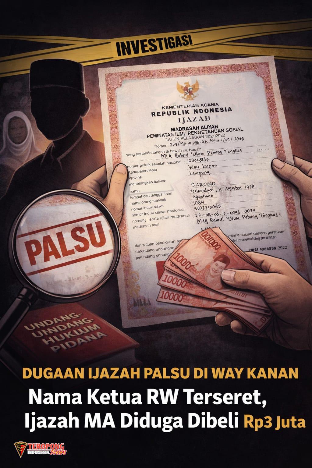 Way Kanan, Lampung – Dugaan praktik pemalsuan ijazah kembali mencuat di Kabupaten Way Kanan. Kali ini, sorotan tertuju pada sebuah ijazah Madrasah Aliyah (MA) Bahrul Ulum Rebang Tangkas yang diduga diperoleh tanpa melalui proses pendidikan yang semestinya.