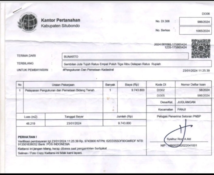 Berdasarkan bukti kwitansi resmi dari Kantor Pertanahan Kabupaten Situbondo tertanggal 23 Januari 2024, seorang warga bernama Bunarto telah membayar biaya pengukuran dan pemetaan kadastral seluas 48.219 m² sebesar Rp9.743.800. Dana tersebut dibayarkan dengan harapan segera mendapatkan kepastian hukum atas tanahnya, namun harapan itu pupus setelah ditemukan kejanggalan fatal dalam dokumen pengajuan.