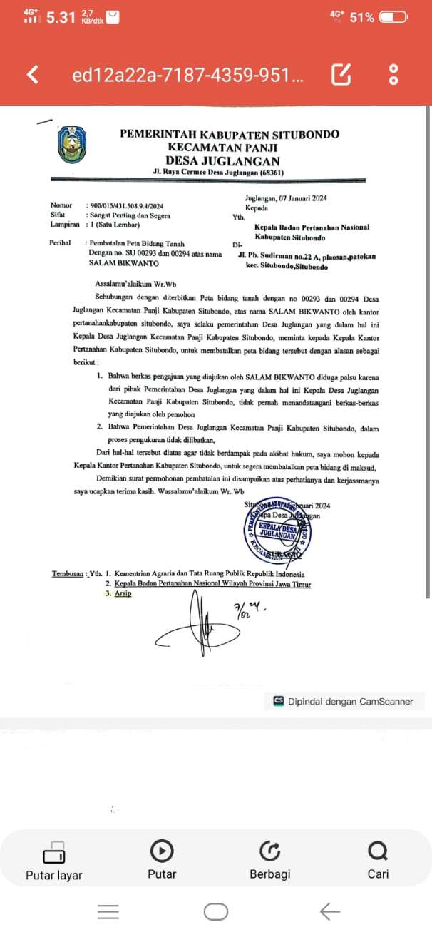 Melalui surat resmi nomor 900/015/431.508.9.4/2024 tanggal 07 Januari 2024, Pemerintah Desa Juglangan secara tegas menyatakan bahwa berkas pengajuan atas nama Salam Bikwanto yang digunakan untuk membuat peta bidang nomor 00293 dan 00294 diduga palsu. Kepala Desa menegaskan tidak pernah menandatangani maupun mengesahkan dokumen tersebut, serta proses pengukuran dilakukan tanpa sepengetahuan aparat desa.